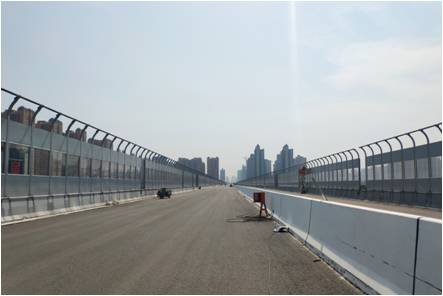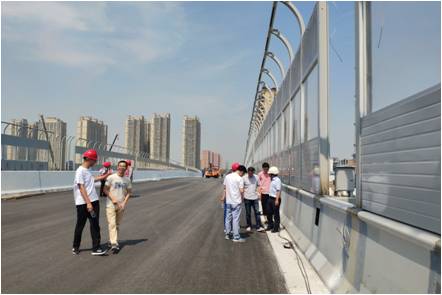 在后期施工配合中,項目設計組成員積極主動為建設方與施工單位提供服務,解決施工中遇到的技術難題,受到了建設方與施工單位的一致認可。在昆明路西段即將建成之際,我公司一分院項目設計組成員主動赴現場回訪,協助施工單位解決鋪裝、護欄安裝、聲屏障安裝過程中遇到的問題,為昆明路東段后續施工提供技術支持與服務,同時也為我公司承攬此類項目積累寶貴經驗。