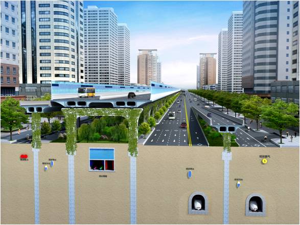 由于昆明路高架沿線地下管線極其復雜,同時又與地鐵、綜合管廊、地裂縫等交織,為保證工程的合理性,項目設計組多次實地踏勘、反復研究,采用了大跨度預應力蓋梁、懸臂梁體系等工程方案對地下管線、構筑物和地裂縫實現精準避讓。同時,為減少行車噪音對橋梁兩側居民生活的干擾,在該項目中首次使用了高4.5m的聲屏障,并在聲屏障頂部設置LED光源,滿足照明與景觀要求。
