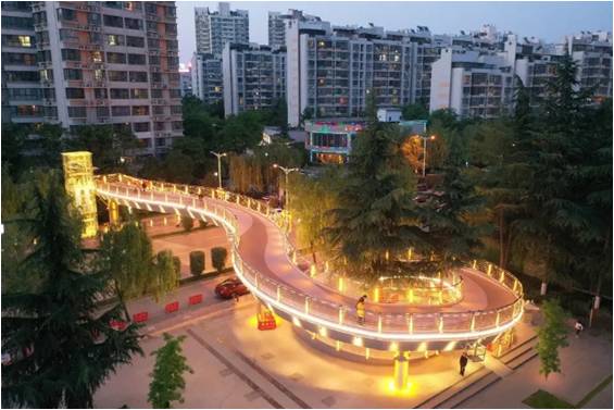 木塔寺人行天橋為高新區首個加裝無障礙垂直電梯的天橋。電梯外觀采用漢唐風格的玻璃剪影,與木塔寺公園相呼應。橋梁欄桿及立柱采用內嵌洗墻燈,梁底采用小投光燈,橋墩采用雙頭壁燈整體打亮,勾勒出橋梁整體線型;并采用暖白光與黃光相結合,營造低調而又典雅的氛圍,夜景照明效果通透大氣。