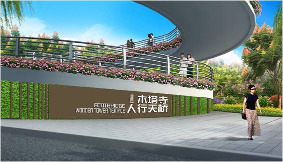 木塔寺人行天橋景觀利用現狀雪松營造局部休憩小空間,地面延用周邊鋪裝,并用深色條帶鋪裝進行分割,體現鋪裝的變換形式,同時采用蓮花造型的地面浮雕作為裝飾,彰顯木塔寺的文化氣息。人行天橋標識牌整體設計簡潔大氣,采用中英文標識以及木塔寺造型logo,體現其獨特性。標牌鏤空處采用立體綠化,與橋體統一協調,既起到了標識作用,又提升了可觀賞性。