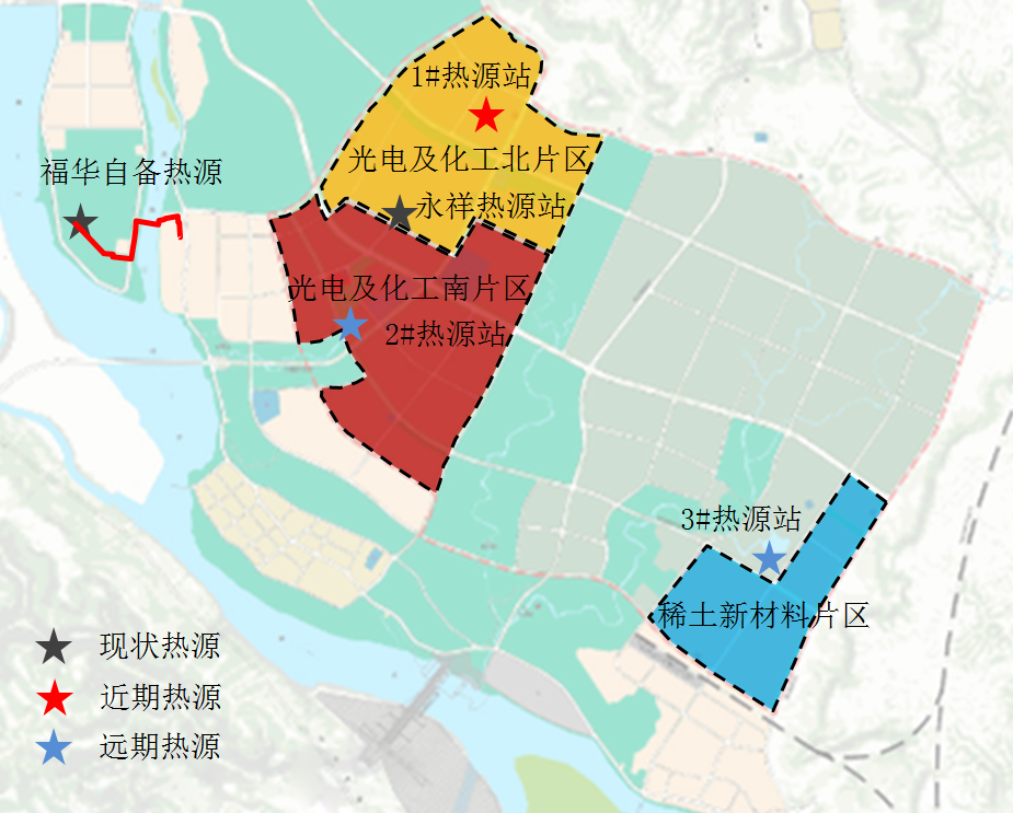本次供熱規劃區別于傳統供熱規劃,由于基地承接原有園區企業退岸入園,熱源選擇受上位規劃確定的區域內排污總量控制指標、鍋爐總蒸發量的限制。我公司項目組成員根據現狀實際情況,分別對當地存在的難以回收生物質資源、清潔天然氣資源、大型化工廠自備熱源富裕容量和余熱等進行了資源量和經濟性分析,確定采用現狀大型企業自備熱源廠和清潔天然氣鍋爐房作為熱源的優選方案。結合基地熱負荷分布密度、子園區產業特性,減小施工難度和工程造價,共規劃三座熱源站。熱源總裝機765t/h,各熱源站通過熱網聯通,實現互聯互通。