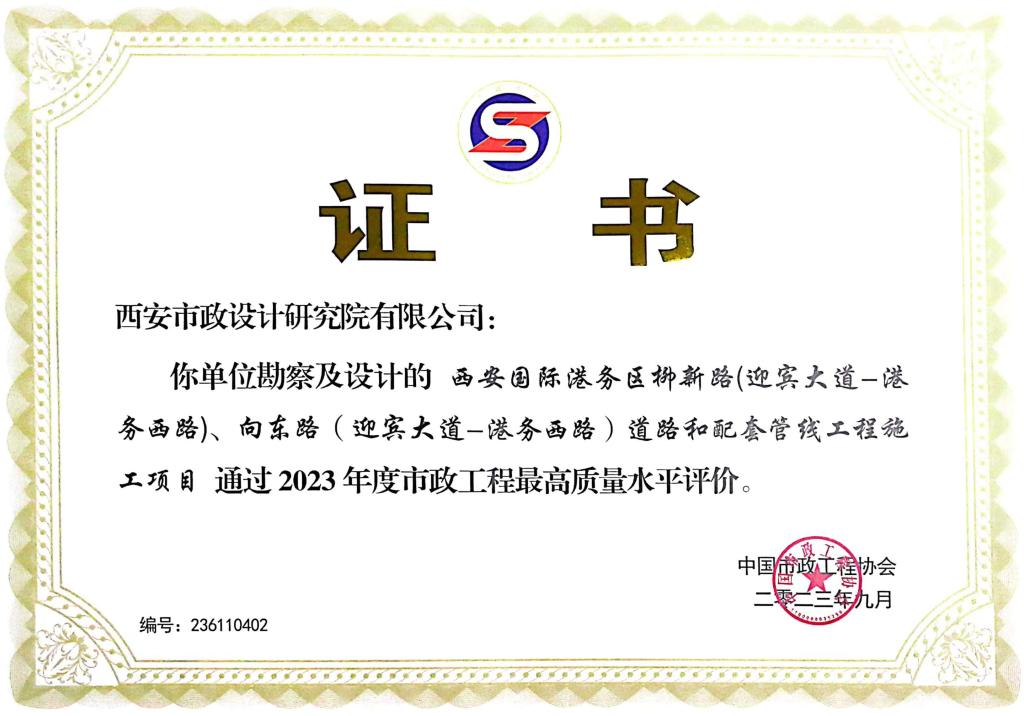 近日,中國(guó)市政工程協(xié)會(huì)頒發(fā)了2023年度市政工程最高質(zhì)量水平評(píng)價(jià)榮譽(yù)證書(shū),我公司勘察設(shè)計(jì)的“西安國(guó)際港務(wù)區(qū)柳新路(迎賓大道-港務(wù)西路)、向東路(迎賓大道-港務(wù)西路)道路和配套管線工程”、“雁翔路及新安路市政工程”獲此殊榮。