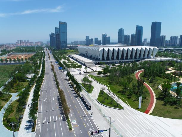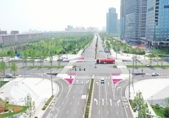 西安國(guó)際港務(wù)區(qū)柳新路(迎賓大道-港務(wù)西路)、向東路(迎賓大道-港務(wù)西路)道路和配套管線工程,為西安國(guó)際港務(wù)區(qū)“六橫五縱”主干骨架路網(wǎng)中重要的“兩橫”,是奧體中心重要對(duì)外交通通道。其中柳新路位于西安奧體中心主場(chǎng)館北側(cè),道路全長(zhǎng)2107.882m,規(guī)劃紅線寬度50m,雙向6車(chē)道;向東路位于西安奧體中心主場(chǎng)館南側(cè),道路全長(zhǎng)1968.553m,規(guī)劃紅線寬度70m,雙向8車(chē)道。主要包括道路、排水、再生水、交通、管溝等專(zhuān)業(yè)。道路設(shè)計(jì)遵循通行舒適、景觀協(xié)調(diào)、公交優(yōu)先、以人為本的設(shè)計(jì)理念,合理分配機(jī)動(dòng)車(chē)、公交車(chē)、非機(jī)動(dòng)車(chē)、行人路權(quán)。在交叉口設(shè)計(jì)中,通過(guò)設(shè)置導(dǎo)流島,使得有限的空間資源最大程度發(fā)揮交通設(shè)施的效率;在人行道鋪裝設(shè)計(jì)中,通過(guò)石材樣式的變化,使得整體鋪裝與周邊景觀綠化、場(chǎng)館相互融合;在慢行空間打造上,重新統(tǒng)籌空間,設(shè)置自行車(chē)專(zhuān)用道;結(jié)合公交、地鐵站點(diǎn)合理布設(shè)自行車(chē)停靠點(diǎn),引導(dǎo)居民采用“自行車(chē)+公交”的出行方式;在附屬設(shè)施設(shè)計(jì)中,通過(guò)港務(wù)區(qū)特有的路緣石、路名牌、車(chē)止石等小構(gòu)件設(shè)計(jì),提升道路整體觀感和使用品質(zhì)。