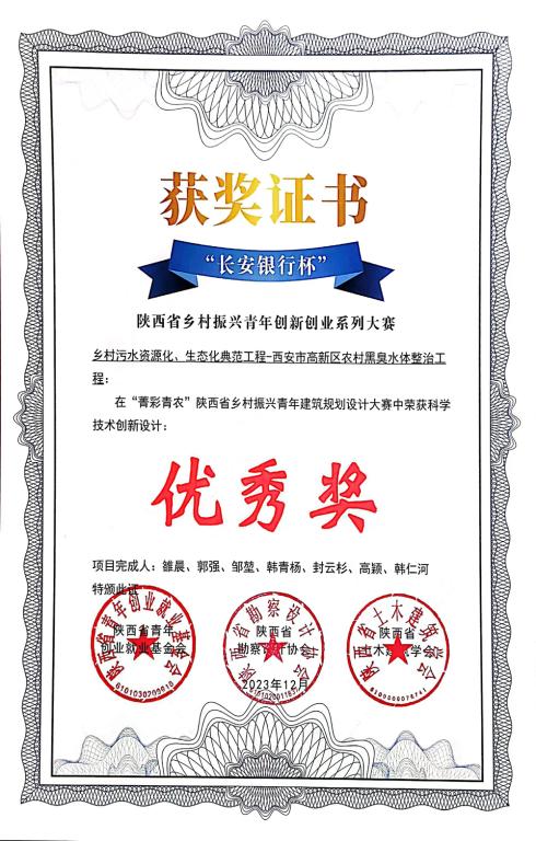 12月17日,由團省委、省科技廳、省住建廳等多家單位聯合舉辦的“長安銀行杯”陜西省鄉村振興青年創新創業系列大賽頒獎儀式在中國建筑西北設計研究院有限公司舉辦,我公司參賽作品《鄉村污水資源化、生態化典范工程—西安市高新區農村黑臭水體整治工程》榮獲“科學技術創新設計優秀獎”。