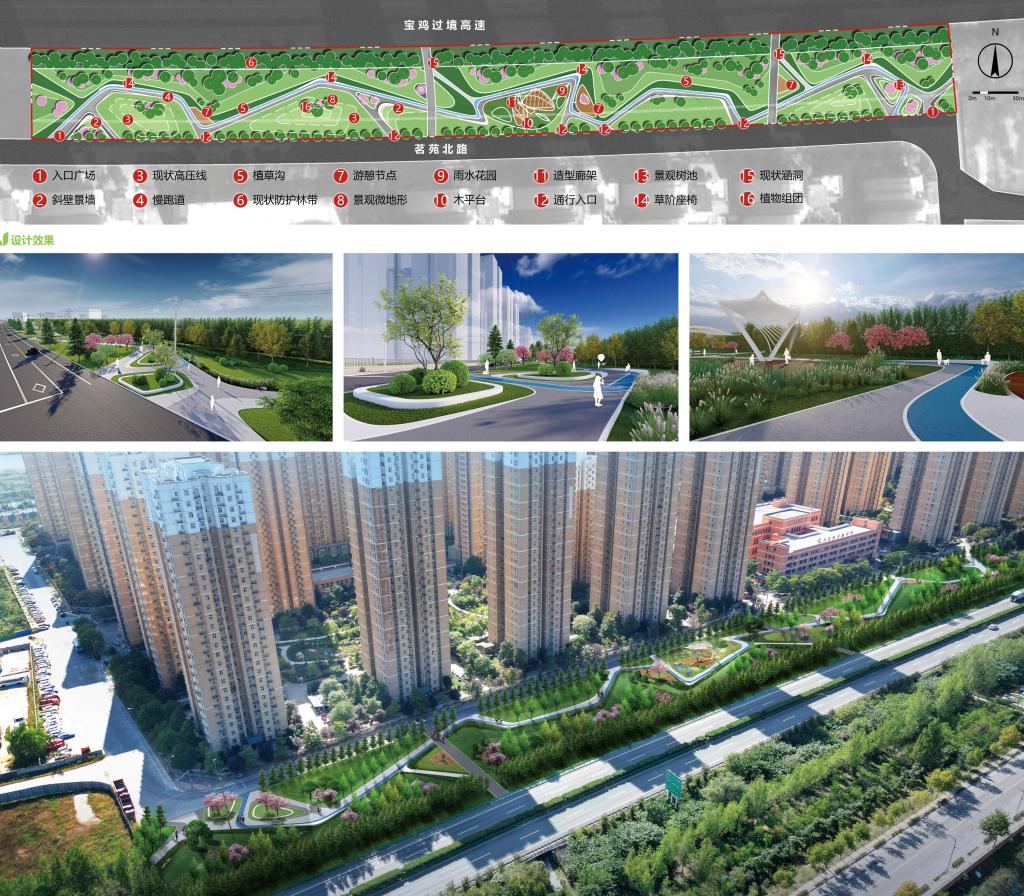 寶雞市陳倉區虢鎮名苑兩儀坊小區北側名苑北路游園,主要服務人群為南側小區住戶,地塊總面積約19800㎡。設計以植物葉脈為元素,采用現代活力的折線線條,避開高壓線,設計場地內包含跑道、鋪裝、游憩空間,打造以人為本、生態海綿城市理念的花園綠廊。